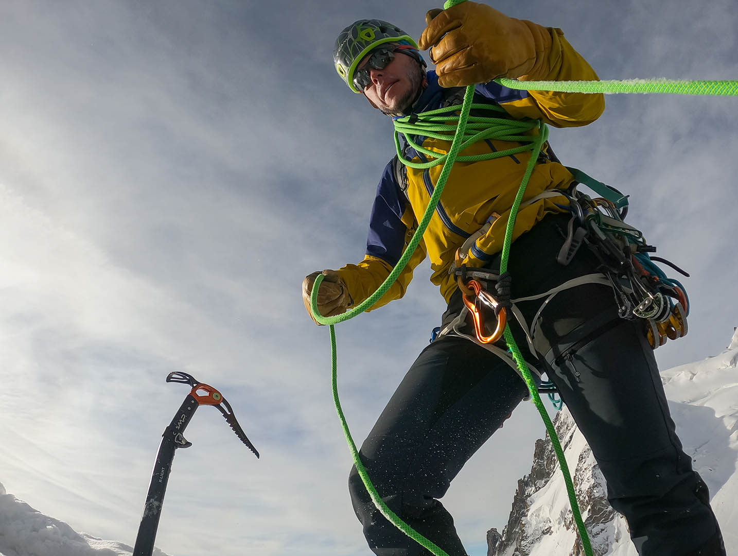 Čeká tě praktický výcvik: práce s mačkami a cepínem, brzdění pádů, navazování družstva, sebezáchrana z trhliny, stavba štandů, slaňování a základy lezení v ledu i firnu.