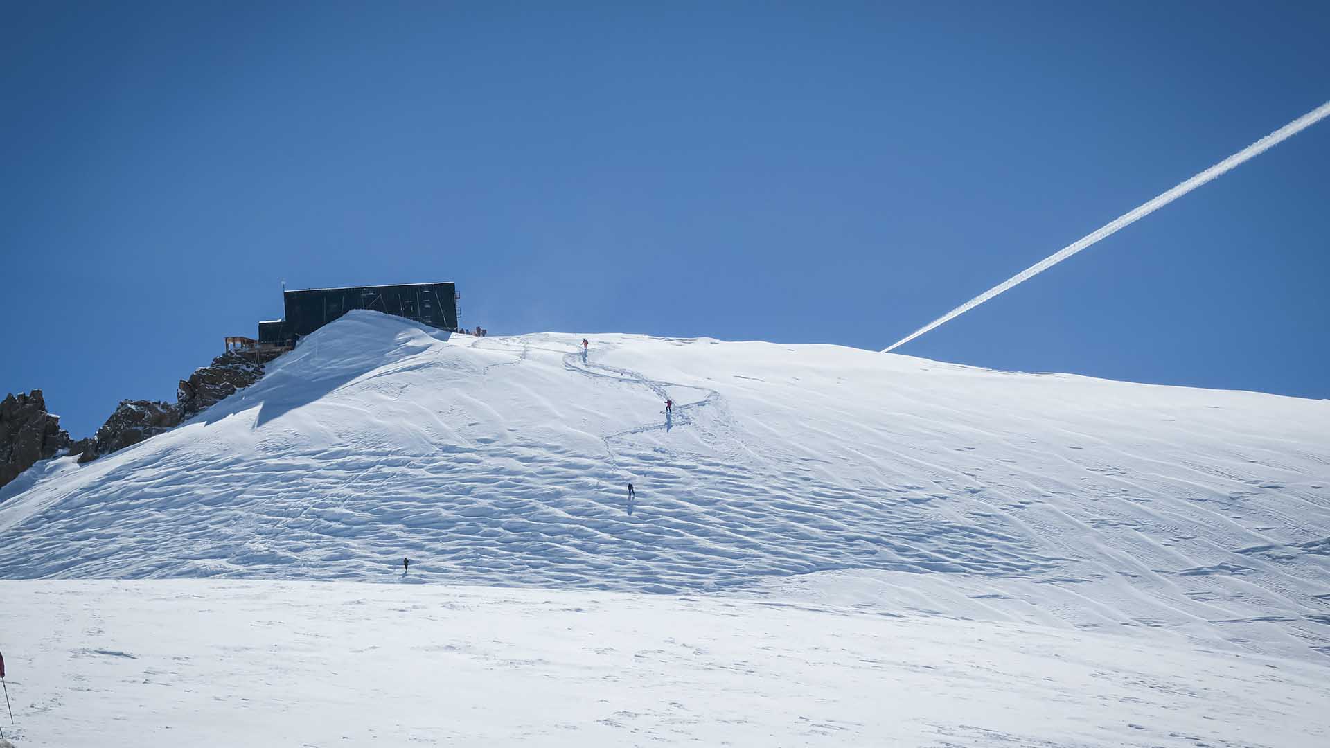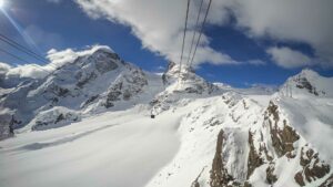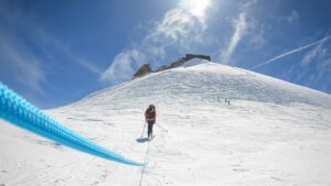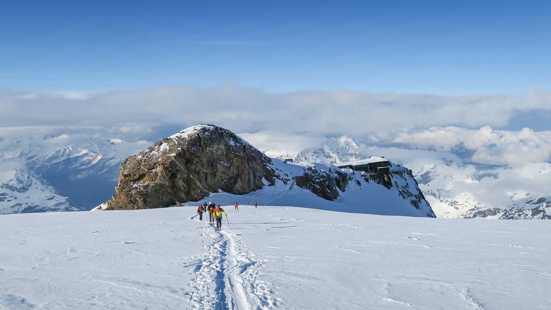 Lanovkou na Klein Matterhorn, aklimatizační výstup na Breithorn (4 164 m). Sjezd a přechod na chatu Rifugio Guide d’Ayas (3 400 m).